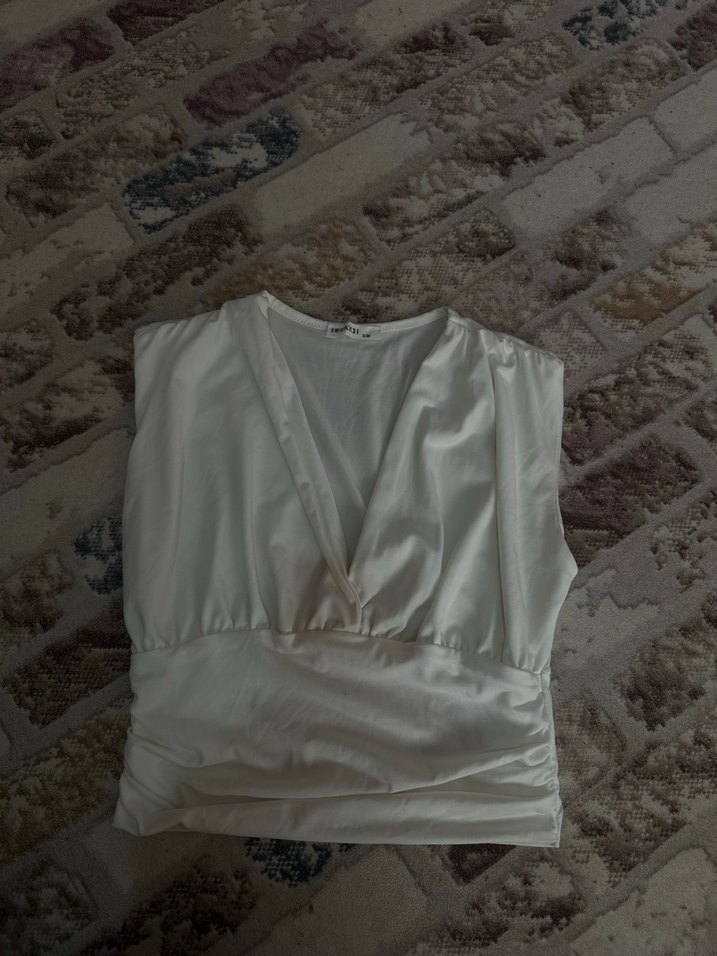 Derin V yakalı, kolsuz beyaz keten bluz, drapeli ve vücuda oturan kesime sahiptir. Kısa boyu ve minimalist desensiz tasarımı günlük kullanıma uygundur.