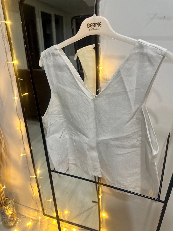 Beyaz Keten V Yakalı Kolsuz Mini Bluz