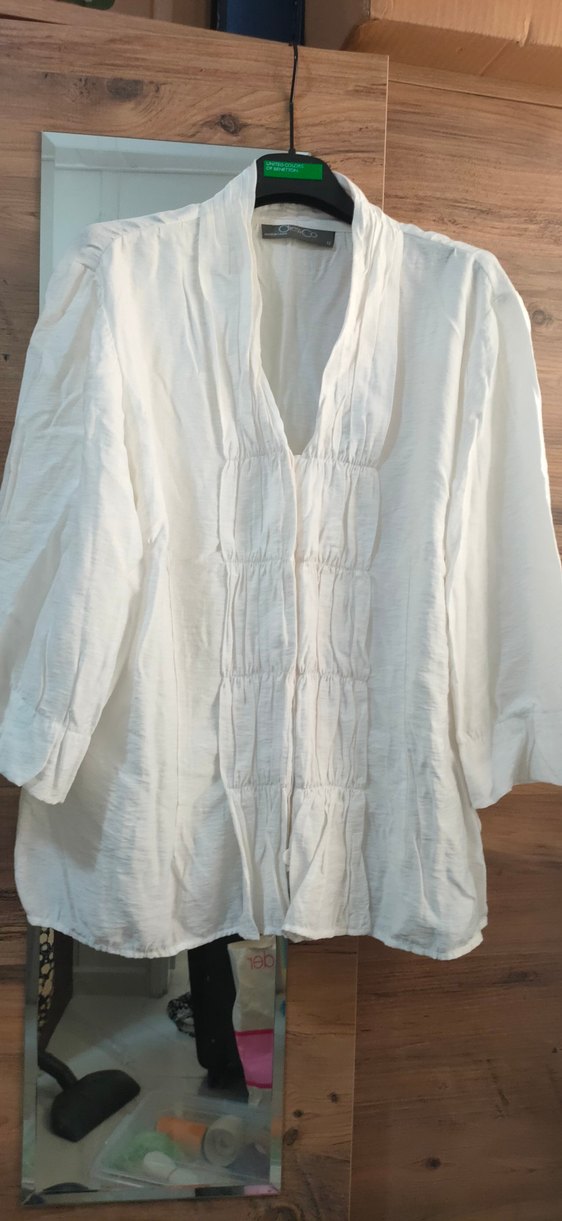 Beyaz keten kumaştan, V yakalı ve pilili detaylara sahip uzun kollu, bol kesim midi uzunluğunda kadın gömleği. Hafif ve bohem tarzda, günlük kullanıma uygun.