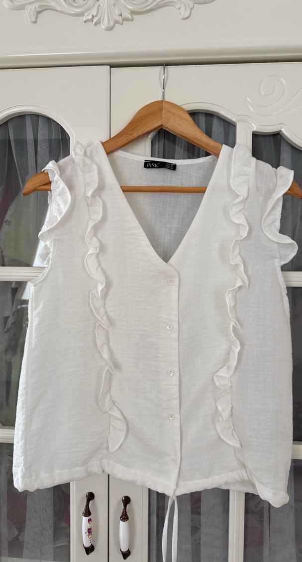 V yaka, volan detaylı, düğmeli, keten beyaz hamile bluzu, salaş kesimle bohem tarz. S beden. Yeni aldım hiç giyemedim 38 bedene de rahat olur . Marka temsili