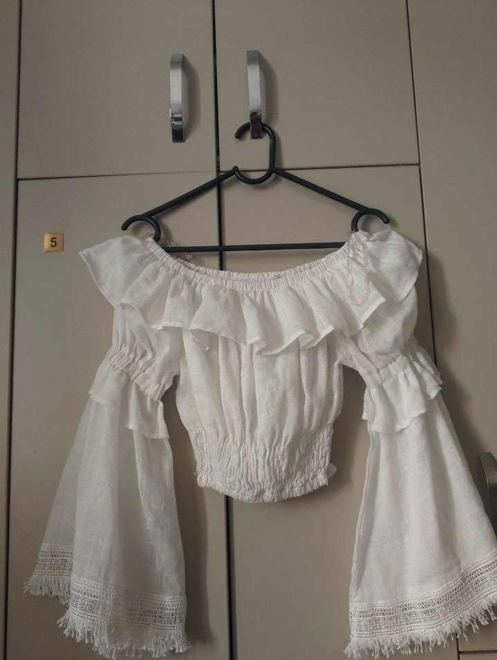 Beyaz keten kumaştan, volanlı, kayık yaka ve geniş manşetli uzun kollarıyla bohem tarzda mini bluz.