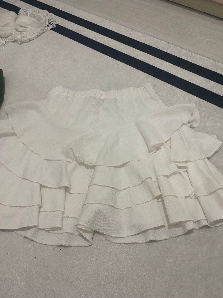 Beyaz keten kumaştan, kat kat volanlı ve bol kesim mini etek. Bohem ve Parisian tarzını yansıtır, günlük kullanıma uygundur.