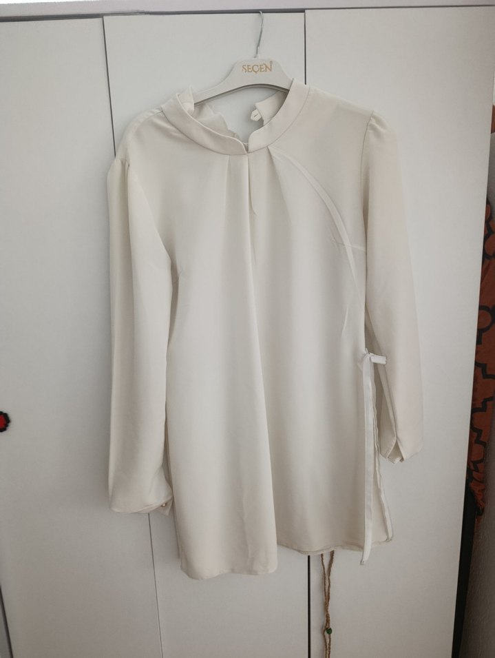Yüksek yakalı, uzun kollu ve keten kumaştan yapılmış beyaz, bol kesim bluz. Drapeli tasarımı ve kısa boyu ile ofis kullanımı için uygundur. Marka: SICEN. ✨