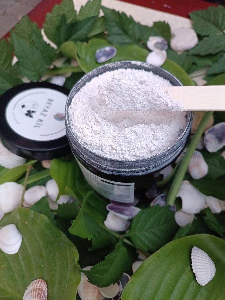 Beyaz Kil maskesi yağlı ve karma ciltler için gülsuyu lavanta suyu ya da normal su ile karıştırabilirsiniz %100 doğaldır yatıştırıcı özelliği vardır sakinleştirir son kullanma tarihi yoktur.