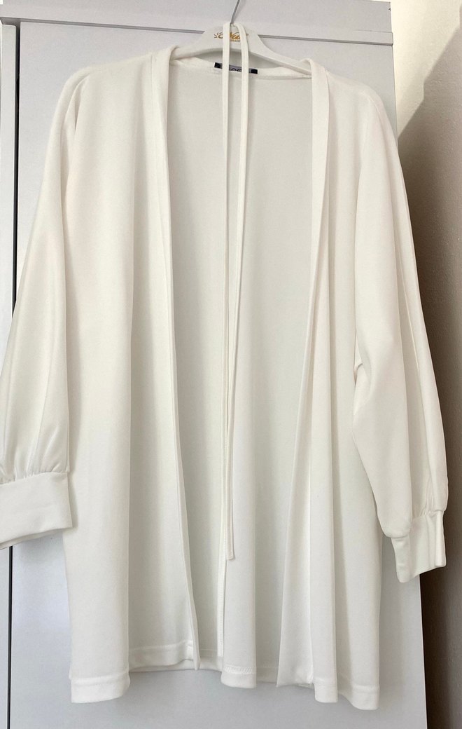 Uzun kollu, salaş kesim beyaz kadın kimono.Desensiz tasarımıyla estetik bir görünüm sunar. Kemeri mevcuttur.