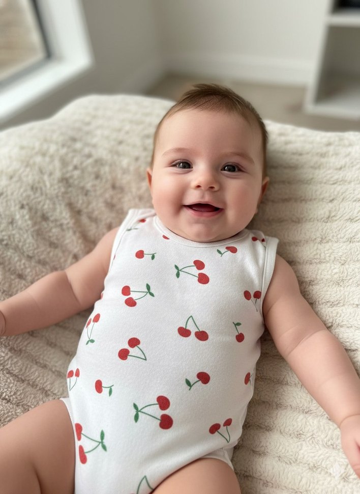 Beyaz renkte, kiraz desenli ve kabarık detaylı kolsuz bebek body. Askısız yakasıyla sevimli bir görünüm sunar.