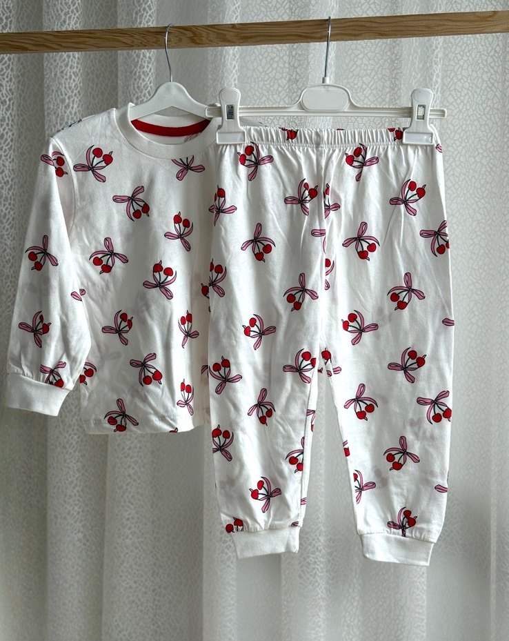 Pamuklu beyaz kumaş üzerine renkli kiraz desenleriyle çocuk pijama takımı, rahat ve eğlenceli bir görünüme sahiptir.