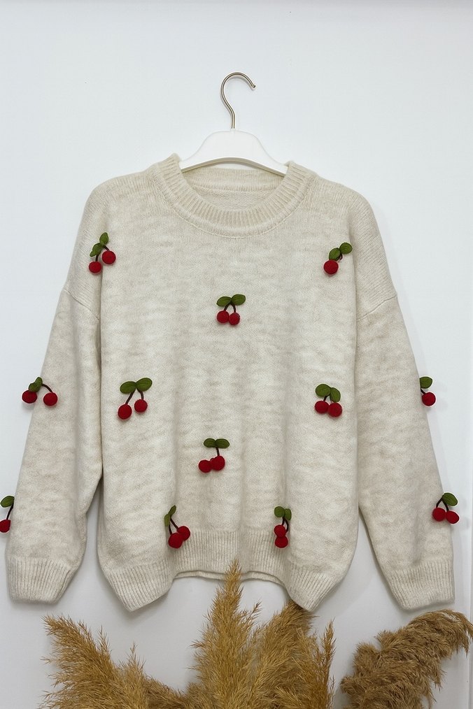 Beyaz renkli, kiraz nakışlı, bohem tarzda, uzun kollu, yuvarlak yakalı, bol kesim kız kazak.