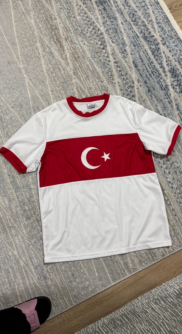 Erkekler için bol kesim, kısa kollu, yuvarlak yaka tişört. Göğüs kısmında kırmızı bant üzerinde ay yıldız baskısı var. Yumuşak sentetik kumaştan, günlük kullanım için rahat ve şık.