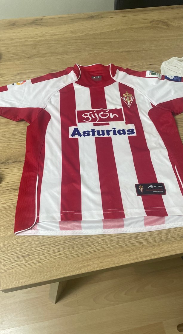 Kısa kollu, yuvarlak yakalı ve bol kesim erkek forma. Sentetik kumaştan, kırmızı beyaz çizgili ve 'Asturias' baskılı. İki koltuk arası eni 39 cm boyu 53 cm 7/8 yaşa uygundur