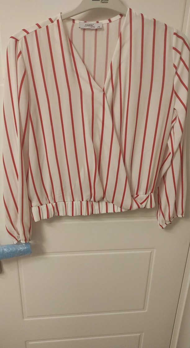 Beyaz Kırmızı Çizgili V Yaka Kadın Gömlek