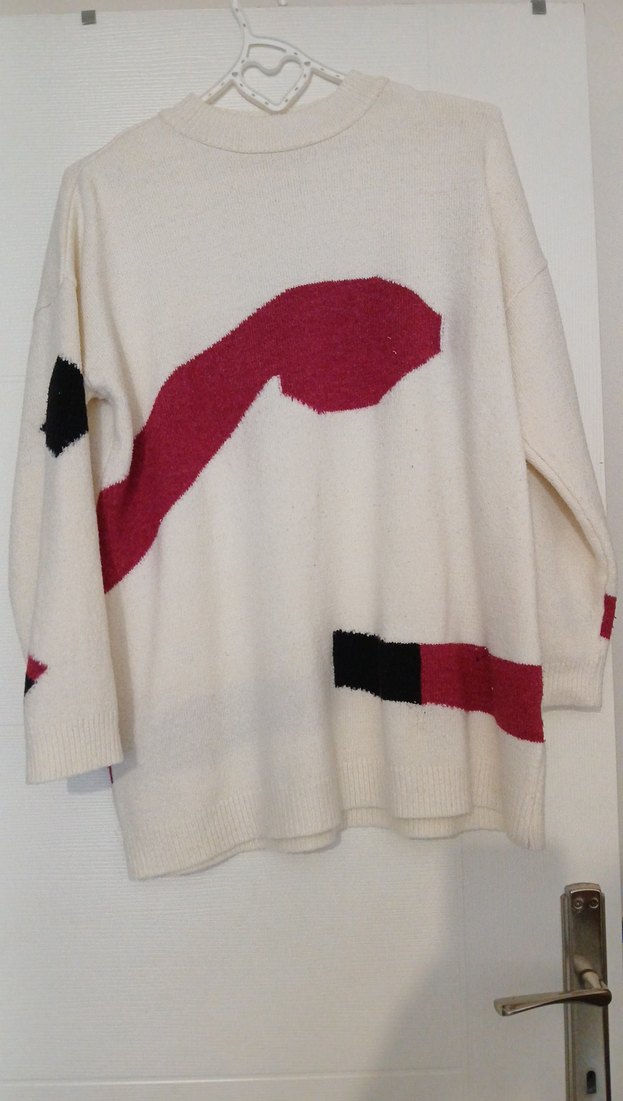 Beyaz zemin üzerine kırmızı ve siyah soyut desenler bulunan, uzun kollu, yuvarlak yakalı, salaş kesim triko kazak. Rahat ve modern tarz sunar.