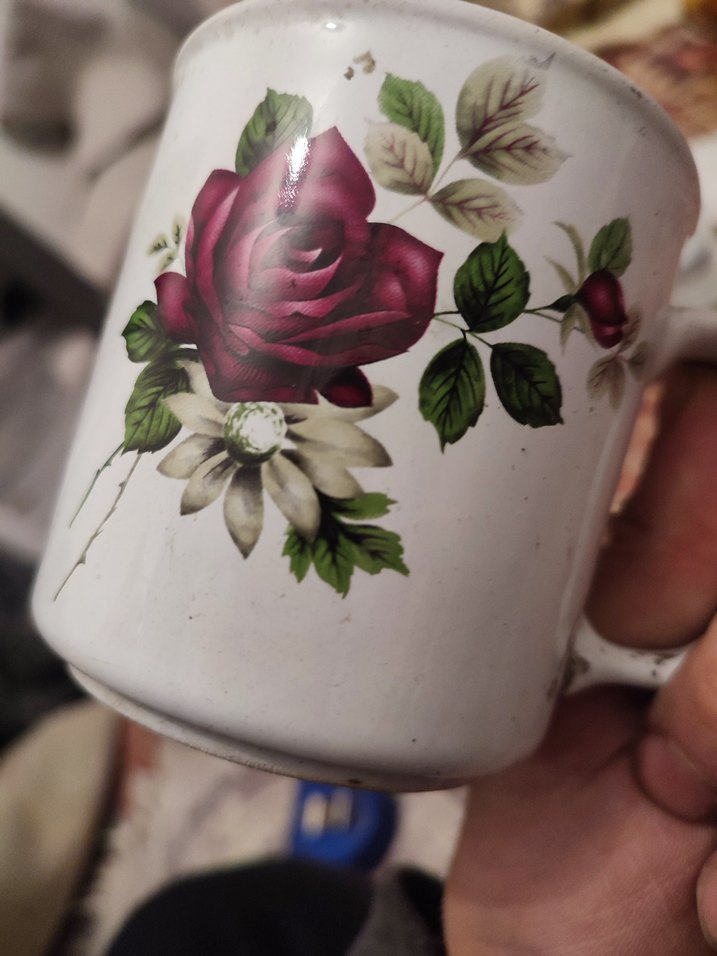 Beyaz renkte, kırmızı gül ve yeşil yaprak desenli klasik görünümlü kupa. Kullanıma engel olmayan ufak bir kırık var 2 ci resimde gösterdim. kullanıma engel teşkil etmiyor