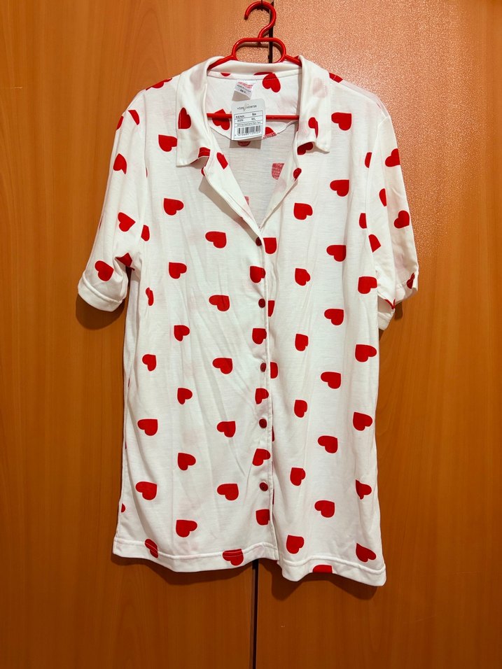 Pamuk kumaştan, kısa kollu, düğmeli ve bol kesim pijama takımı Üzerinde kırmızı kalp desenleri bulunan, günlük ve rahat stili için uygun bir parça. ❤️m L beden hadise den alınmıştır etiket mevcuttur
