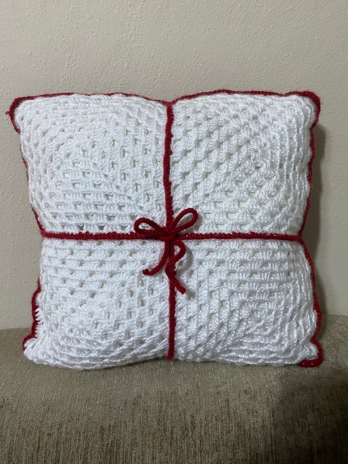 Beyaz Kırmızı Kenarlı Örgü Dekoratif Yastık