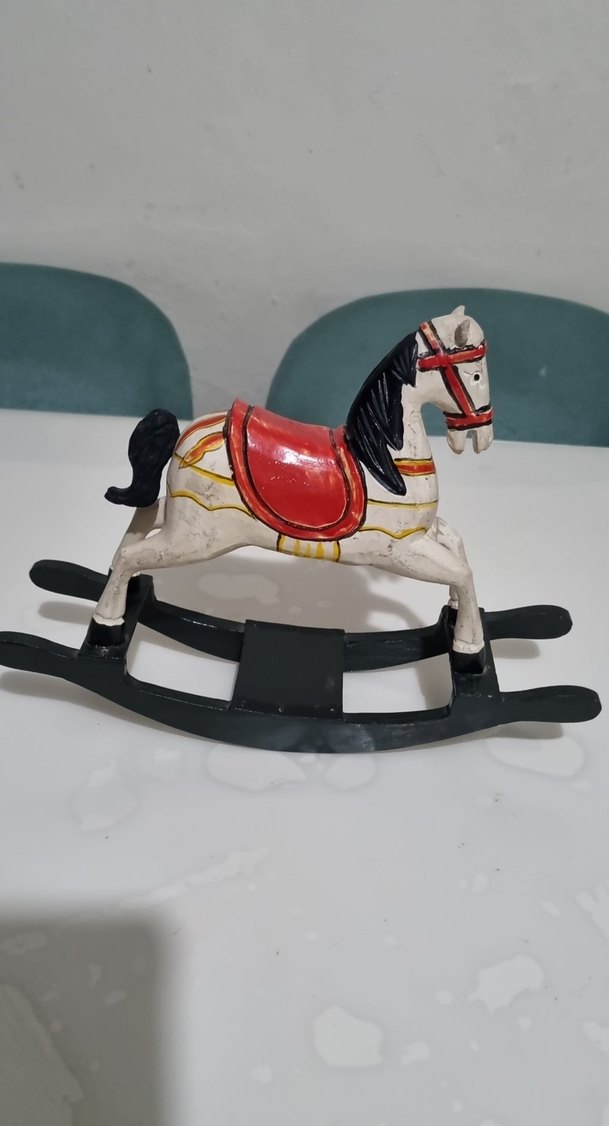 Beyaz renkli sallanan at oyuncak, kırmızı eyer ve siyah tabanlıdır, renkli detaylara sahiptir. Klasik dekoratif veya oyun amaçlıdır.
