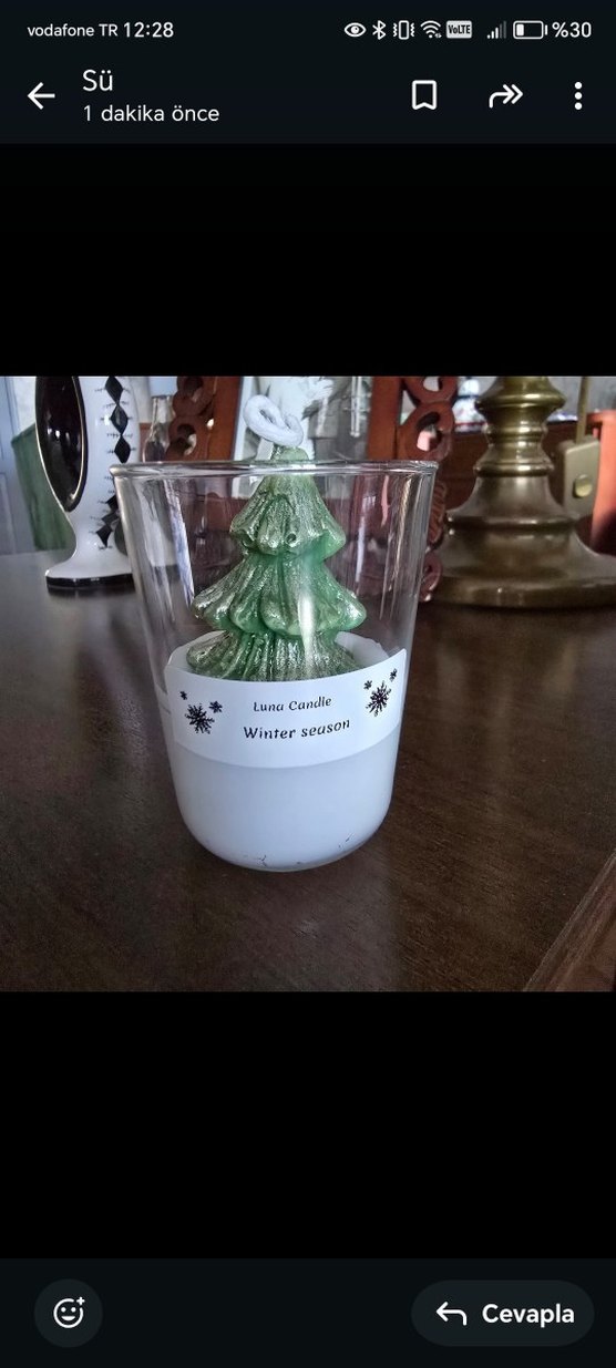 Yeşil çam ağacı şeklinde fitile sahip beyaz mum, şeffaf camlık içinde. Üzerinde 'Winter season' yazılı etiket bulunur. ❄️