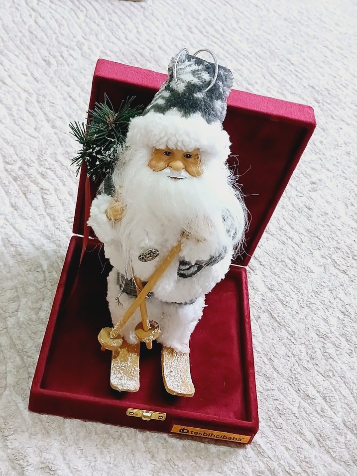 Koyu şapkalı ve kayaklı beyaz Noel Baba biblosu, kayak sopalarıyla birlikte kırmızı kadife kutuda sunuluyor .tertemiz 25 cm