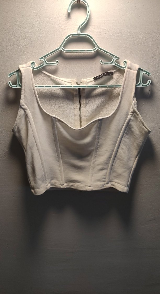 Beyaz, askısız ve sırtında fermuarlı, vücuda oturan kısa bustiyer. Yumuşak sentetik kumaştan, günlük şık sokak stiline uygun. ✨