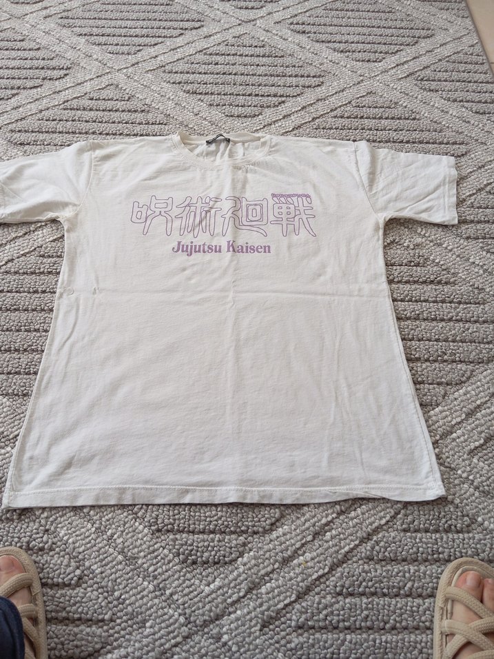 yuvarlak yaka, kısa kollu, bol kesim beyaz bayan tişört.Üzerinde 'Jujutsu Kaisen' baskısı vardır. Günlük kullanıma uygundur.