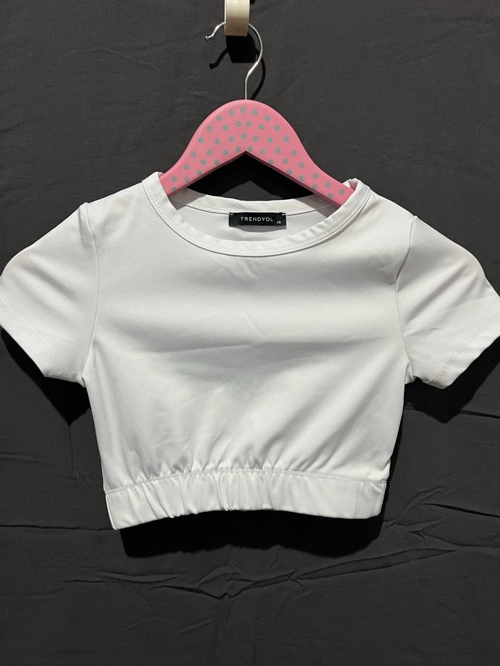 Bu beyaz crop top, kısa kollu ve yuvarlak yaka olup, pamuklu yumuşak kumaştan yapılmıştır. Kısa ve vücuda oturan kesimiyle günlük kullanıma uygundur.