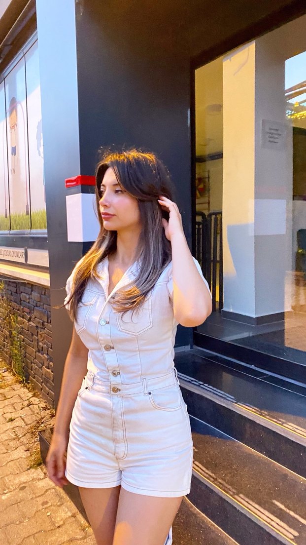 Beyaz denim kısa tulum, V yaka ve kısa kollu, vücuda oturan kesimiyle günlük sokak stiline uygun şık bir seçimdir.