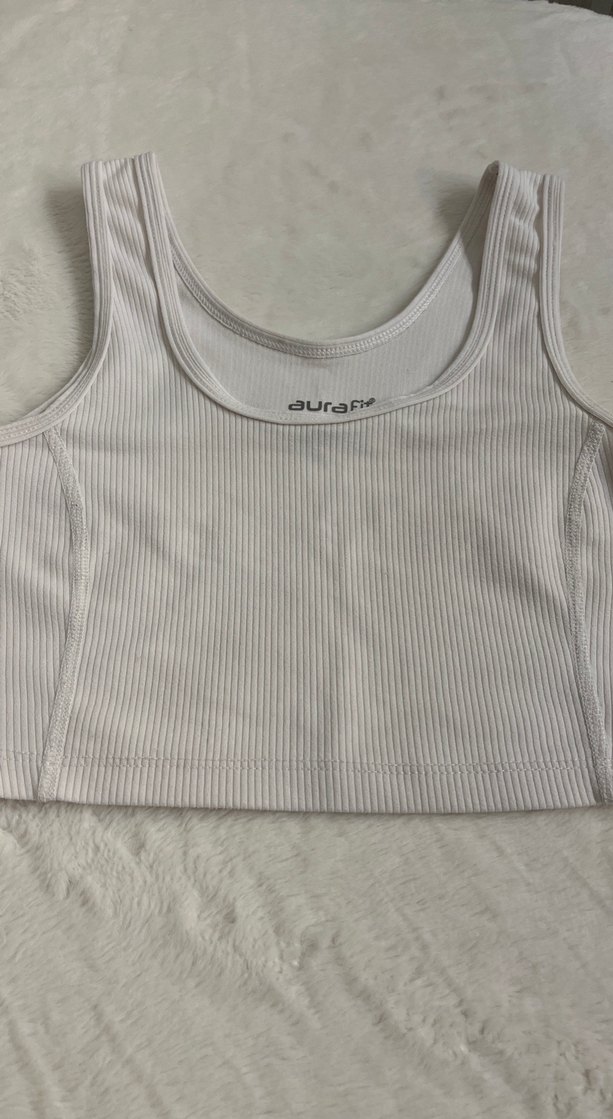 Beyaz, kısa ve dar kesim, kayık yaka, kolu olmayan atlet. Pürüzsüz sentetik kumaştan, günlük kullanım için uygun. ⚡