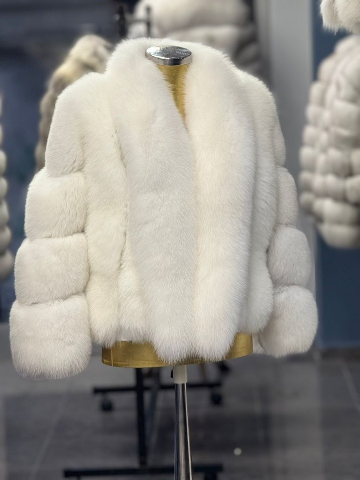 Uzun kollu, kısa boy beyaz kürk detaylı kadın mont, düzenli kesim ve yumuşak, peluş dokulu kumaşla tasarlanmıştır.
