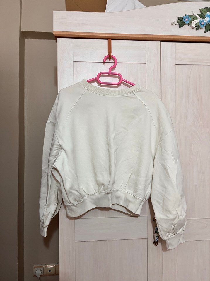 Beyaz, kısa kesim ve uzun kollu kadın sweatshirtü, rahat kesimi ve yumuşak keten kumaşıyla günlük kullanım için uygundur. Zara marka