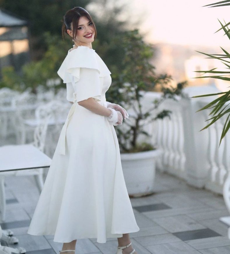 Beyaz renkli, kısa kollu, A kesim uzun gelinlik. Straplez yakası ve klasik modern Paris esintili şıklığıyla dikkat çeker.
