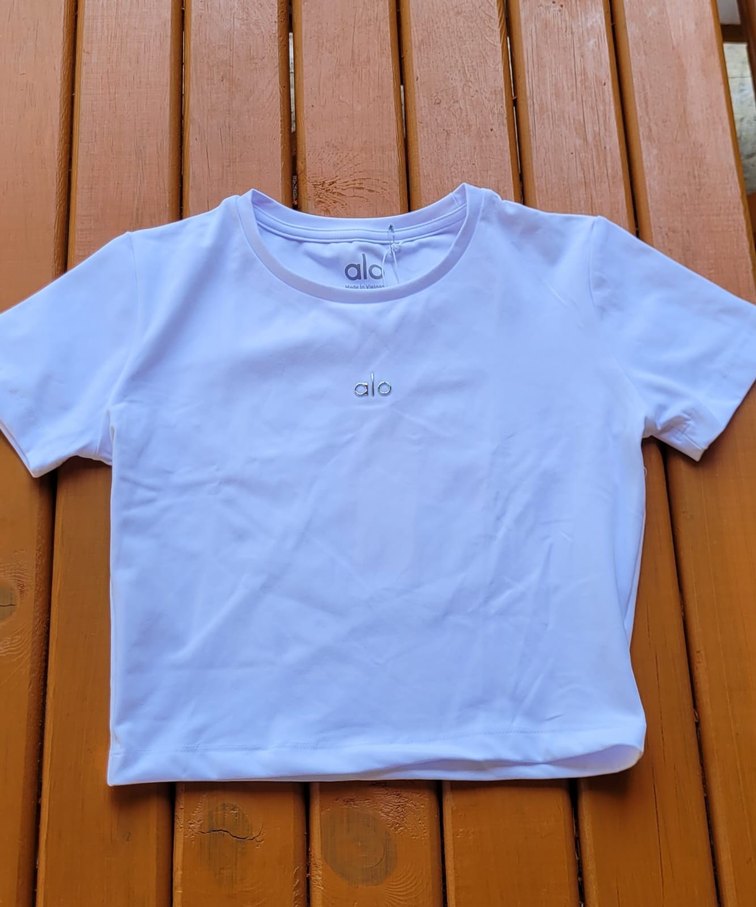 belize kumaş , beyaz kısa kollu tişört/bady, kısa boyda. Önünde 'alo' baskılı, günlük sokak stili için uygun. ALO etiketli S S M L