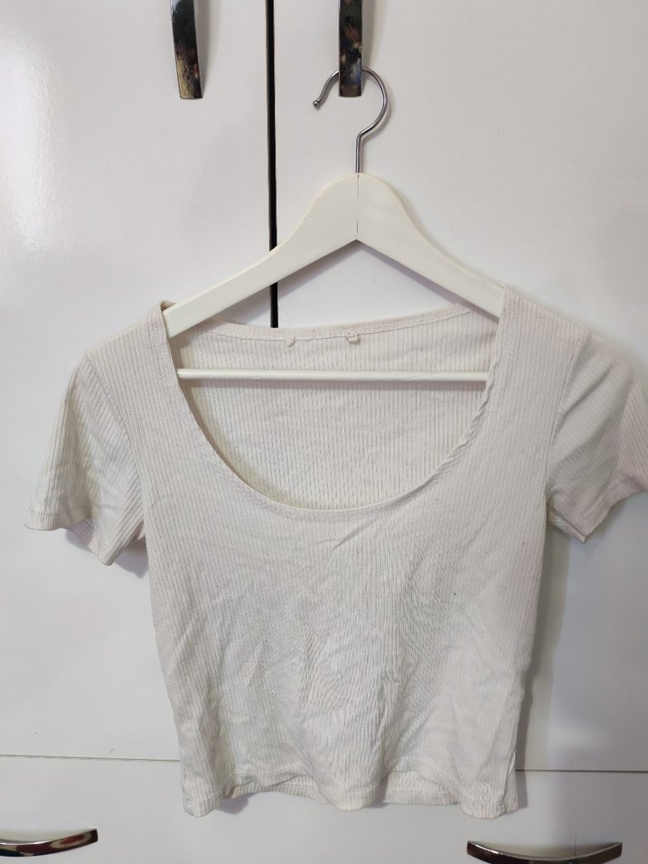 Beyaz, kısa kollu, yuvarlak yakalı ve nefes alabilen keten kumaştan yapılmış basic crop top. Minimalist, desensiz ve günlük kullanım için uygun.