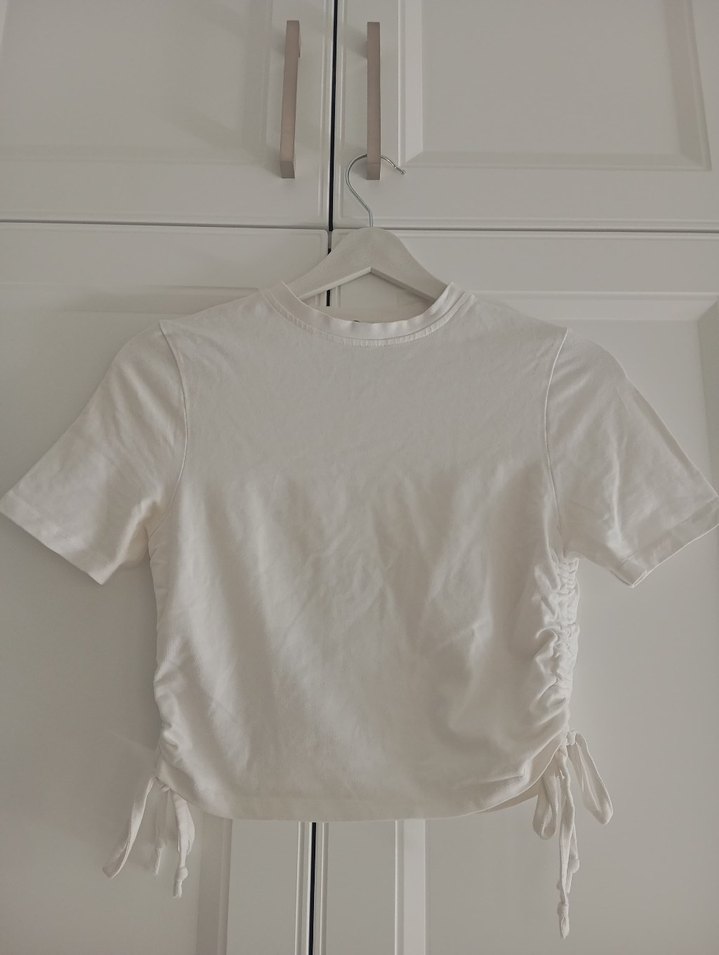 Beyaz, kısa kollu ve yuvarlak yaka, yumuşak keten kumaştan yapılmış fitted crop top. Yanlarda bağcıklı büzgü detayı bulunur. Minimalist, günlük kullanım için uygun. kalıbı dardır xs ve s bedenlere uygundur