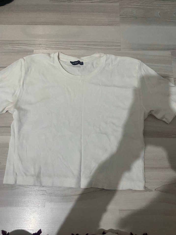 Pamuk kumaştan, kısa kollu ve bisiklet yaka beyaz kadın tişörtü.hafif göbeği açık.