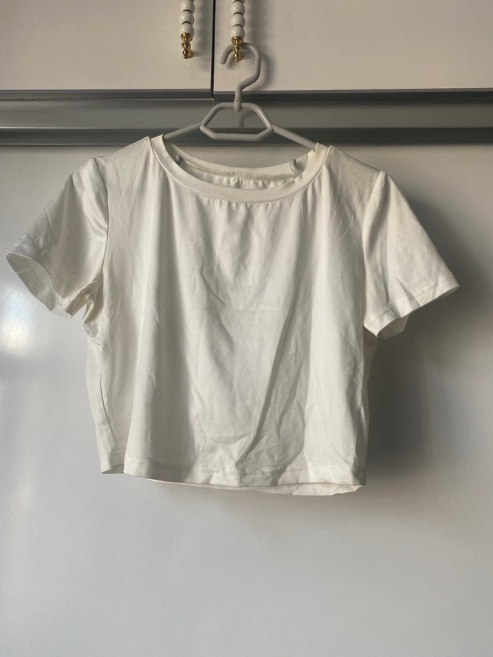 Beyaz keten kumaştan, kısa kollu ve yuvarlak yakalı, salaş kesim basic tişört. Minimalist ve rahat günlük stil için uygun.