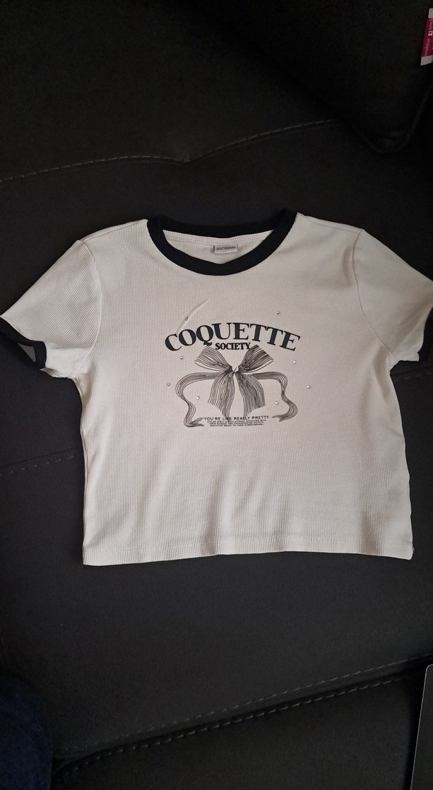 Pamuklu beyaz crop tişört, kısa kollu ve yuvarlak yaka, siyah detaylı. Baskılı ve fırfırlı, trend günlük stil için uygun.