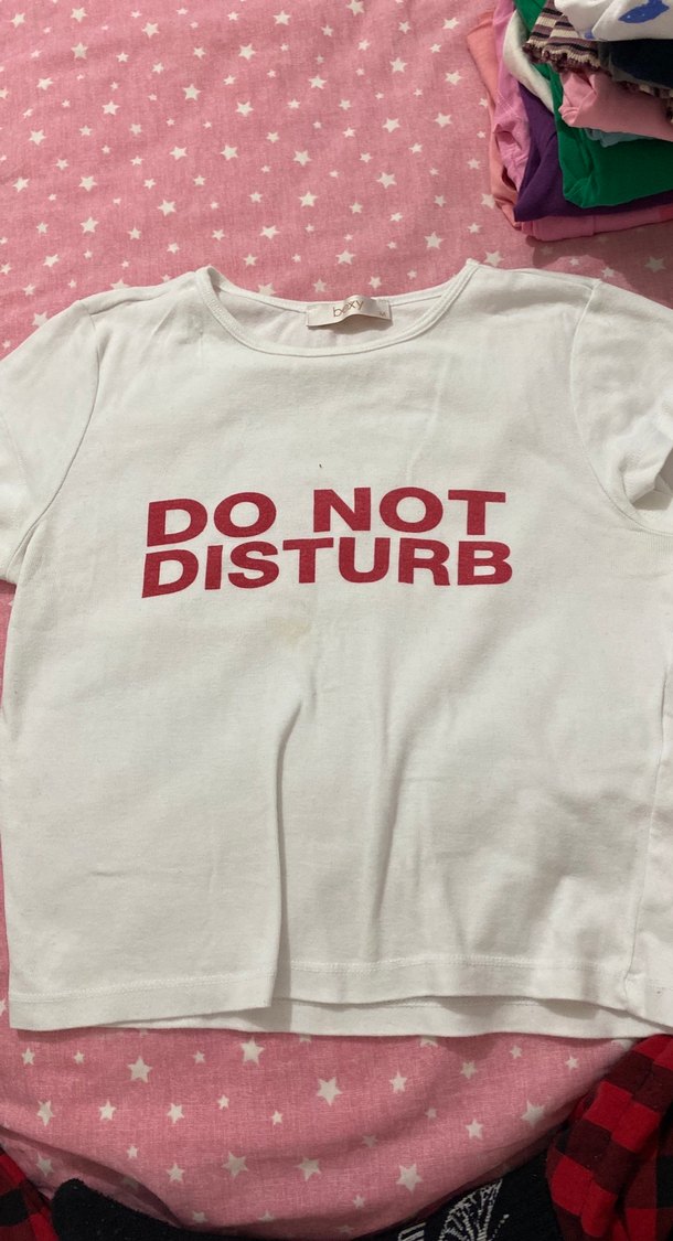 Pamuklu, kısa kollu, beyaz renkli ve kırmızı "DO NOT DISTURB" baskılı tişörtü. Rock punk tarzına uygun, rahat ve şık bir seçim.