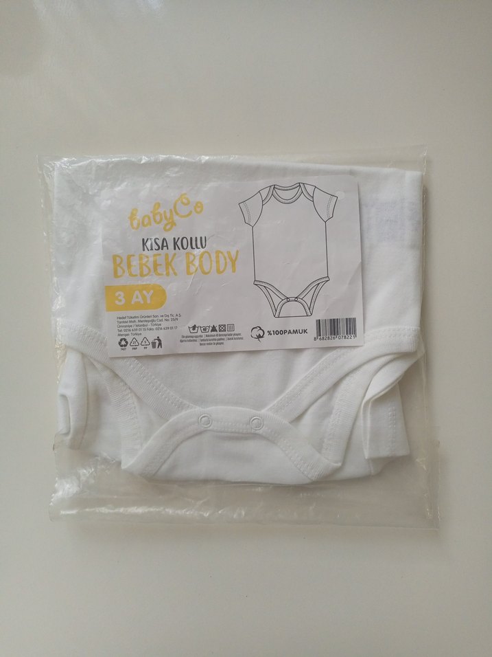 Beyaz renkli, kısa kollu ve elastik özellikli 3 aylık bebekler için body. Yumuşak ve nefes alabilen kumaştan, yuvarlak yakalı.