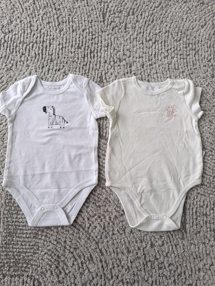 Yumuşak pamuklu, kısa kollu, iki beyaz bebek zıbını. Rahat ve sade tasarım, günlük kullanım için uygun. LC Waikiki olan 1-3 ay, panço olan 3-6 ay etiketli fakat ölçüleri aynı. 1-3 ay kullanıma uygundur.