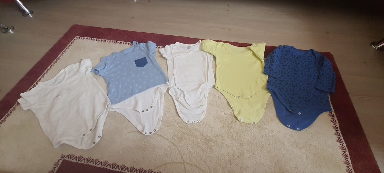 Pamuklu, beyaz pastel renkli kısa kollu bebek zıbını. Düğmeli ve yuvarlak yakalı, normcore tarzda.