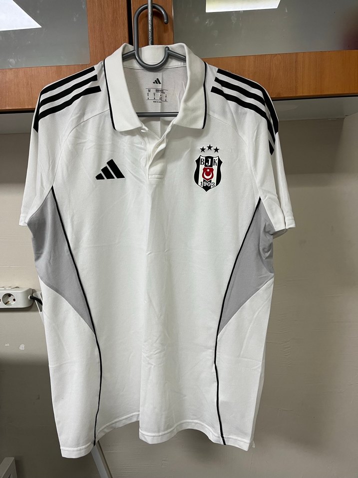 Beyaz kısa kollu erkek forma, polo yaka ve düğmeli plaka detaylıdır. Beşiktaş baskısı ve siyah omuz çizgileri vardır. Gri yan panellerle dar kesimdir.