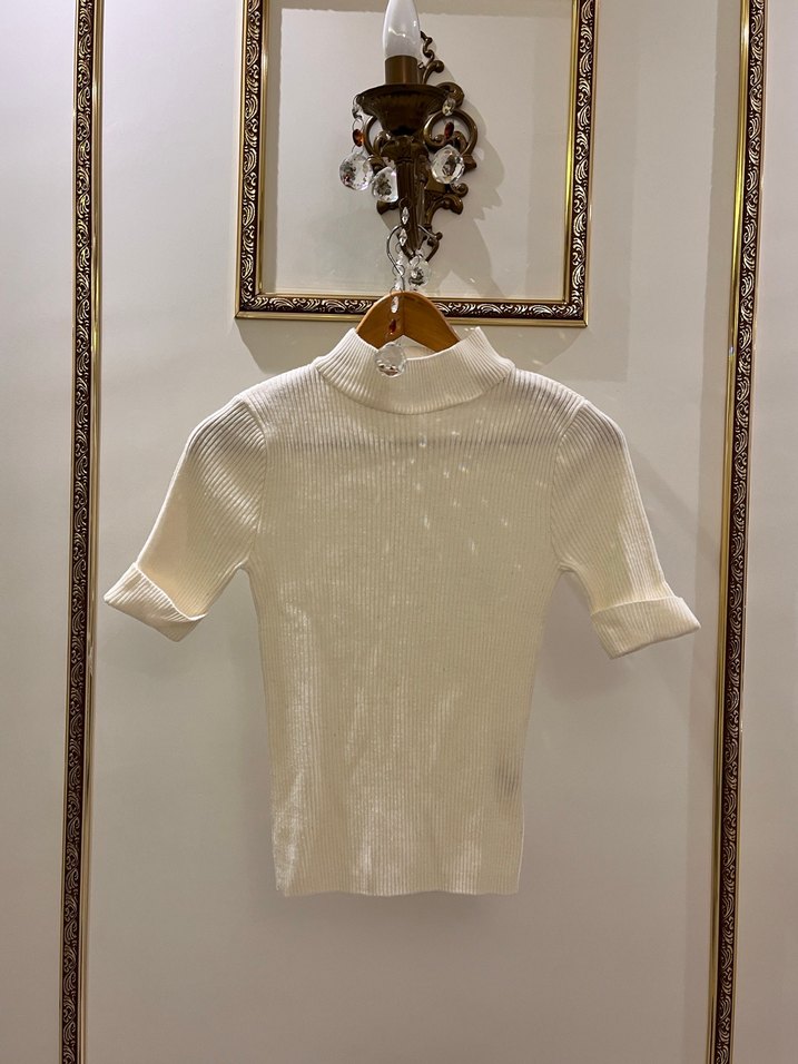 Kısa kollu ve boğazlı beyaz triko. İnce dokuma, normal midi boyda. Uygun iç çamaşırıyla iç göstermiyor. Hiçbir sorunu yok. Tüm ürünleri göndermeden hemen önce tekrar yıkayıp gönderiyorum
