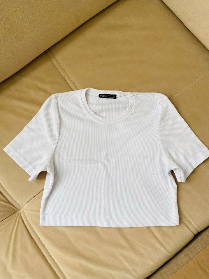 Pamuklu, kısa kollu, yuvarlak yakalı beyaz crop tişört. Minimalist tasarımı günlük kullanım için uygundur.