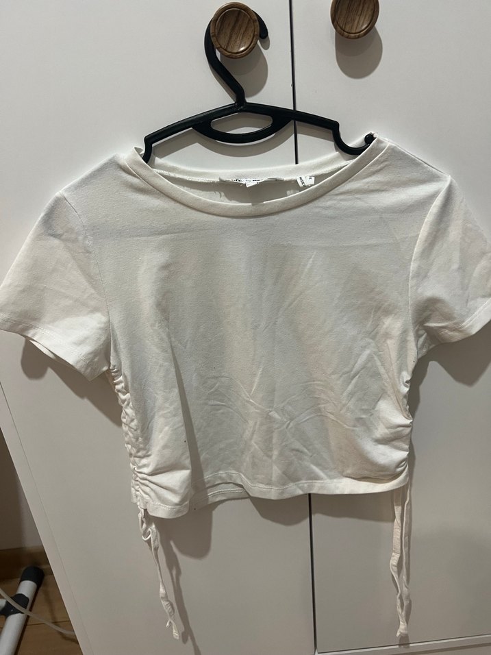 Beyaz crop top, kısa kollu ve yuvarlak yaka, hafif keten kumaştan. Yanlarda bağcıklı, vücuda oturan kesimle günlük sokak stiline uygun.