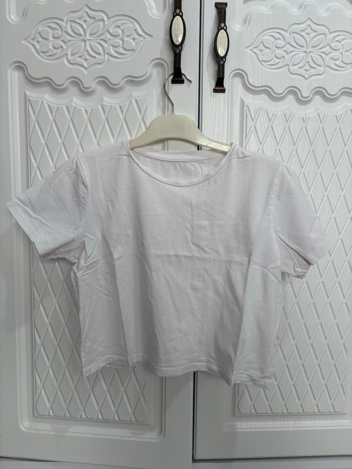 Yumuşak keten kumaştan, kısa kollu, bol kesim ve yuvarlak yakalı beyaz crop top, minimalist sokak stili için uygun.