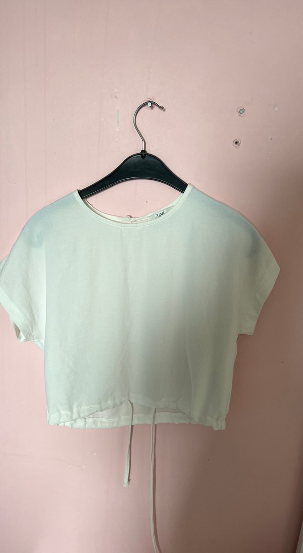 Beyaz, kısa kollu ve yuvarlak yakalı crop top, keten kumaştan rahat ve bol kesimdir. Minimalist ve sade tarzda, günlük sokak giyimi için uygundur.