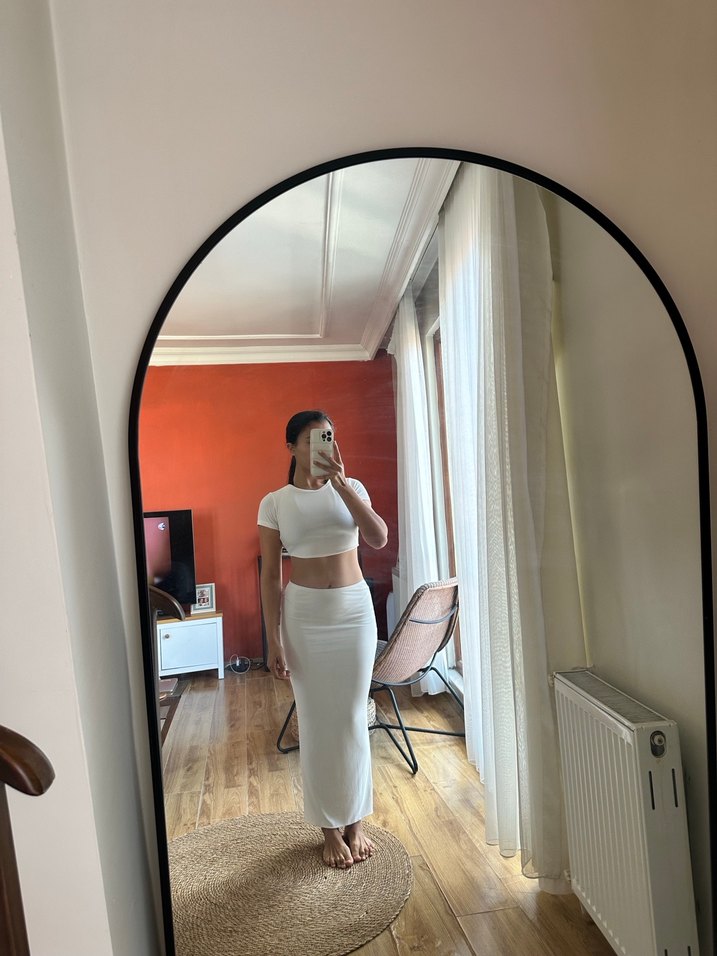 Beyaz Kısa Kollu Crop Top ve uzun etek takım