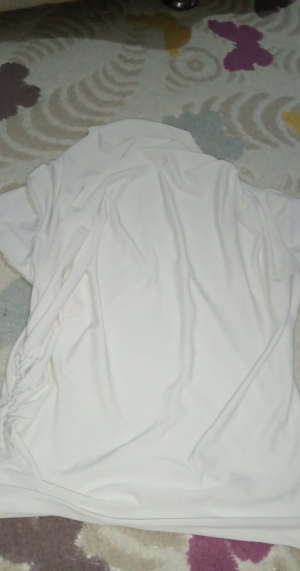 Beyaz, kısa kollu, drapeli ve balıkçı yaka hamile bluzu. Hafif keten kumaştan, bol kesim ve midi boyda, dış mekan kullanımı için uygun.