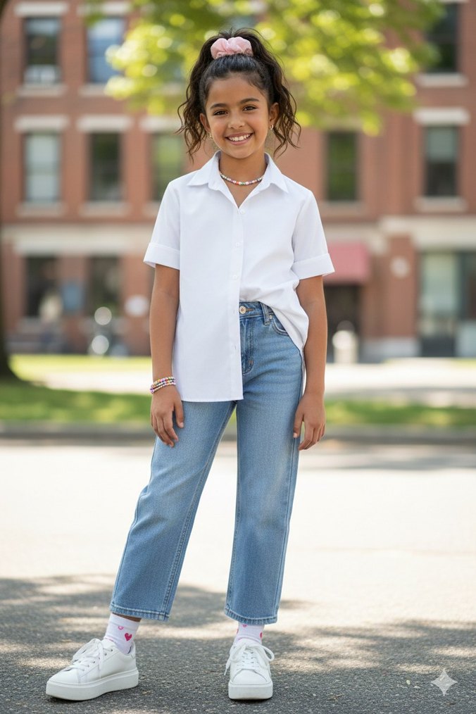 Beyaz renkli, kısa kollu, düğmeli ve yakalı kadın gömleği. Keten kumaştan, rahat kesimli, günlük sokak stili için uygundur. sayili giyilmistir