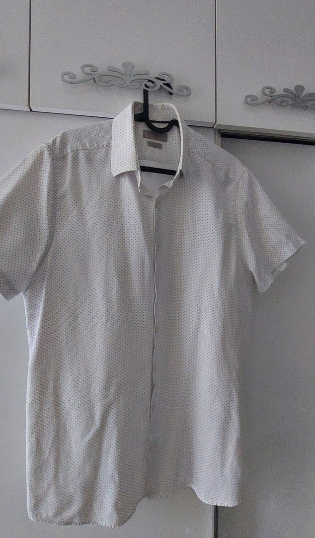 beyaz kısa kollu, düğmeli ve yakalı erkek gömleği. kombininize şıklık katan parça. pazarlık payı vardır.